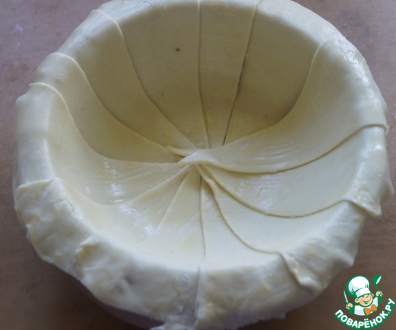 Форму для выпечки смазываем растопленным сливочным маслом и выкладываем в нее лепестки теста, они должны слегка заходить друг на дружку.