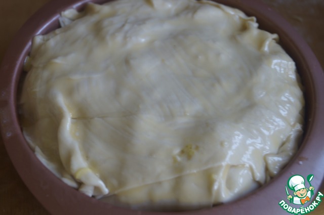 Загибаем свисающие части лепестков теста к центру. Обрезанные остатки теста раскатываем в тонкий пласт и накрываем этим слоем рис. Смазываем растопленным сливочным маслом. Запекаем в разогретой до 180 гр. духовке около 45-60 минут до золотистого цвета. Перед подачей на стол лепестки нарезаем острым ножом. Так же можно красиво подать плов открыв лепестки к верху в большом блюде. Подаем в теплом виде. Приятного аппетита!