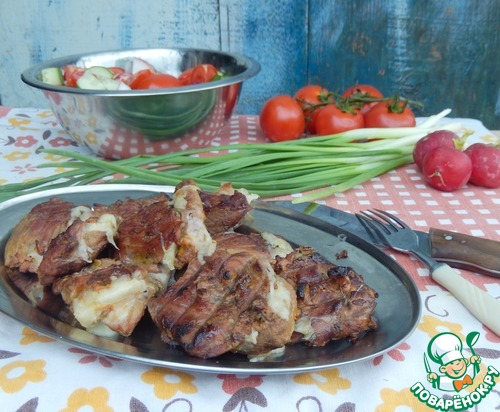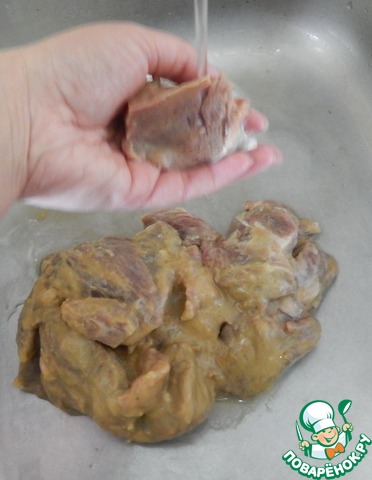 Горчица сделает мясо более мягким но в конечном блюде ее вкус не чувствуется. Время прошло промываем мясо от горчицы.