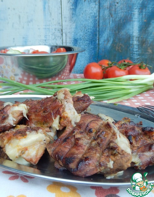 Укладываем мясо на решетку. Плотно друг к другу. Ставим готовить на среднем жаре. Как только сыр пытается сбежать из мяса, переворачиваем, переворачивать придется часто. Часть сыра конечно все равно убежит, но главное что при плавке он отдав мясу свой сок. Сделает мясо более сочным изнутри.