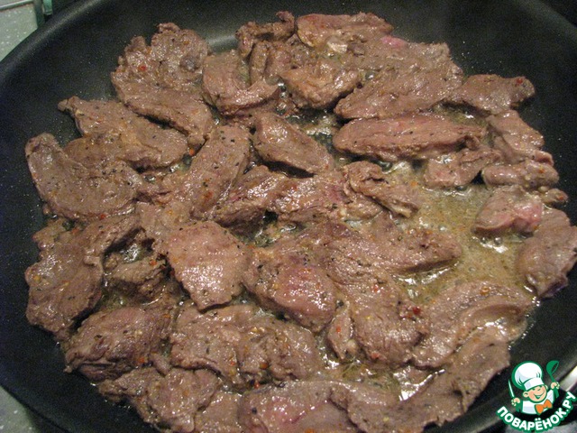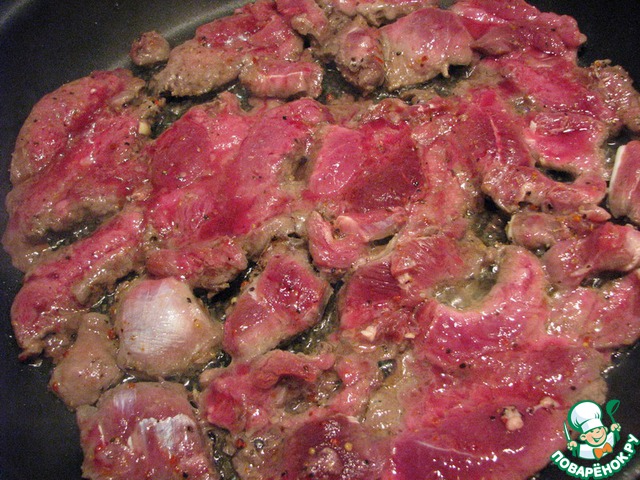 Разогреваем сковороду, сильно!!! Масло не наливаем, оно есть в маринаде. Быстренько начинаем выкладывать мясо на сковородку.