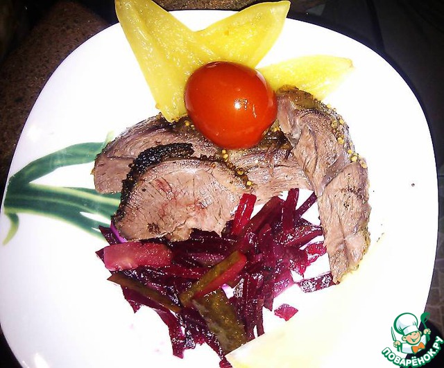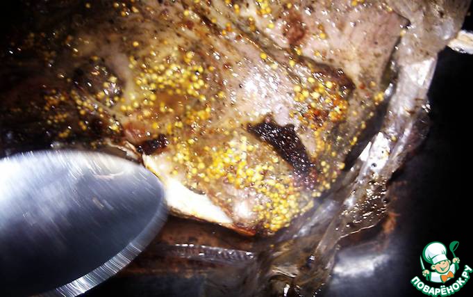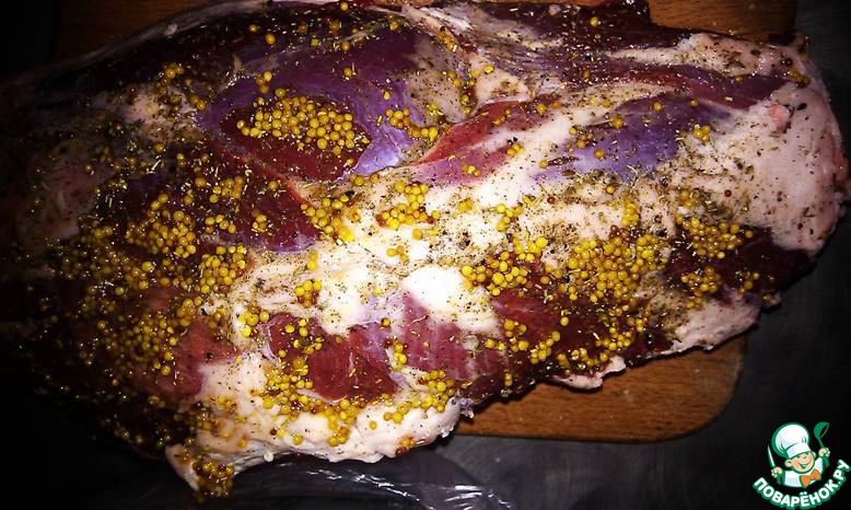 Травы перемалываем в ступке, смешиваем с солью и делаем "сильный" массаж, втирая смесь в мясо. Затем обмазываем горчицей и на 3-4 часа в холод. Лучше на дольше, но у меня, как всегда, времени было в обрез.