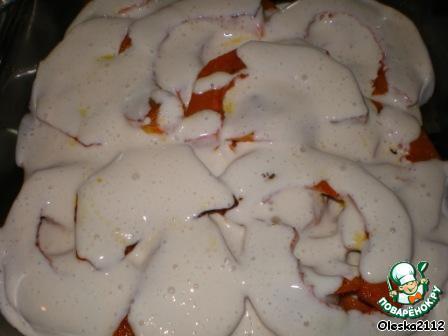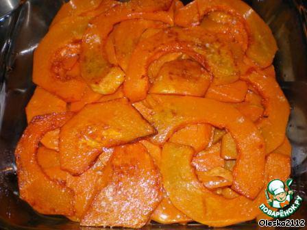 Уложили всю тыкву? Заливаем сверху майонезом. Я использую вот такой. http://www.povarenok.ru/recipes/show/34235/ И ставим в духовку минут на 15-20 при t 150*С.