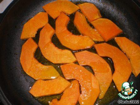 Тыкву режем полукольцами толщиной не более 0,5 см. Выкладываем в сковороду и слегка обжариваем на растительном масле на умеренной температуре. Обжариваем с двух сторон.
