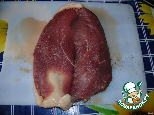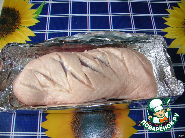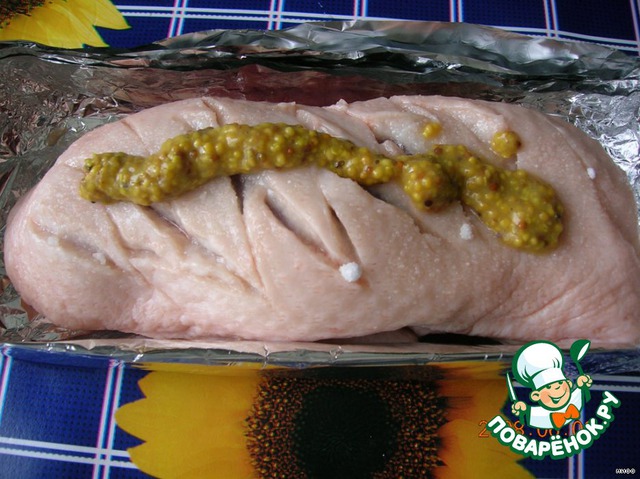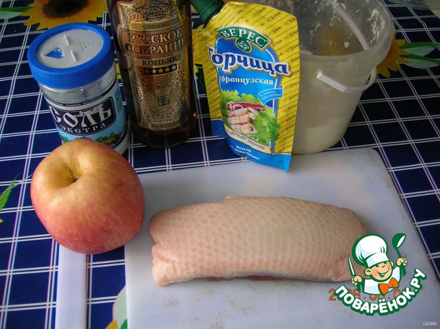 Подготавливаем яблоки, режем сегментами. Утиные грудки насекаем ножом со стороны кожи, разрезаем вдоль, но не до конца, разворачиваем, подсаливаем с обеих сторон. На одну сторону укладываем нарезанные яблоки, сбрызгиваем коньяком. Накрываем второй половинкой, скрепляем для удобства зубочистками. Из фольги готовим коробочку, брала в 4 слоя, так как тонкая. Укладываем в коробочку фаршированную грудку, сверху намазываем горчицей, майонезом. Ставим в духовку на 45 минут при 220 град.