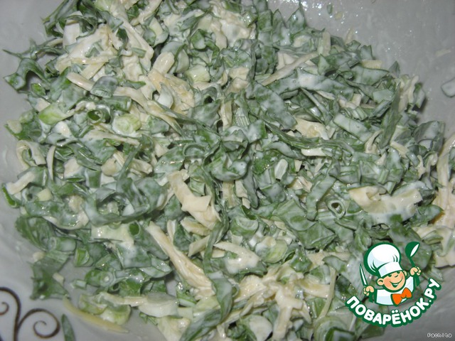 Сыр натереть, соединить с нарезанной зеленью и щавелем, добавить сметану, посолить.
