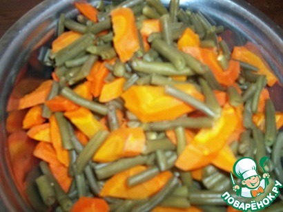Стручковую фасоль и морковь крупно нарезать и отварить вместе до полуготовности, минут 10, в одной кастрюльке. Откинуть на дюршлаг.