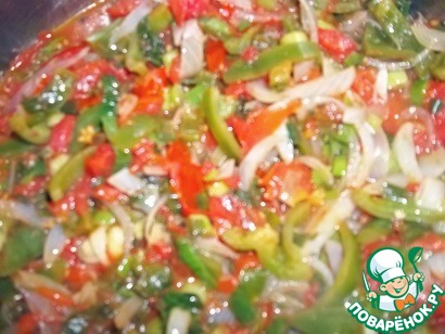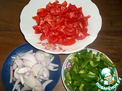 В это время крупно нарезать помидоры, сладкий перец и лук. Перец лучше брать красный или желтый, блюдо получится очень красивым (у меня был зеленый перец)