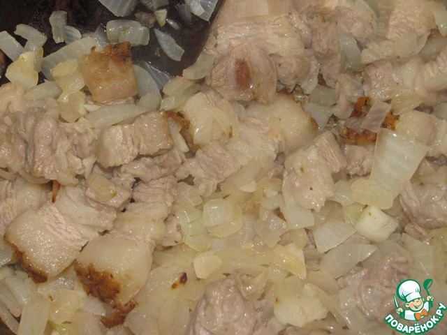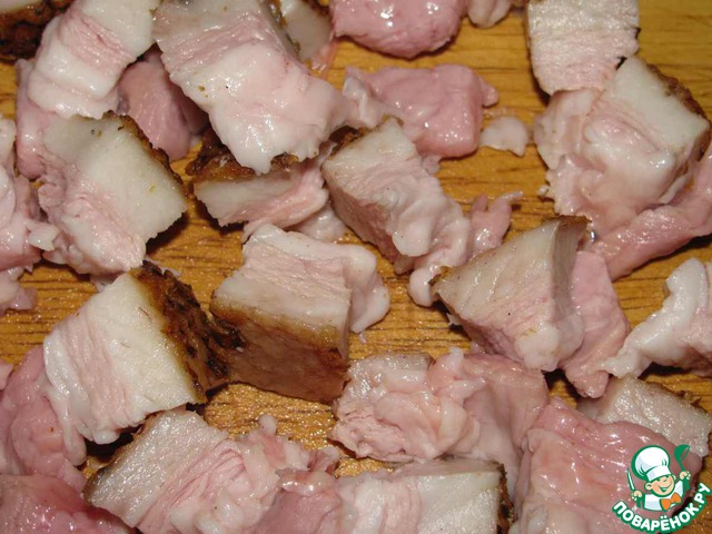 Разогреть в большой кастрюле 3 ст. л масла и припустить в нем лук. Добавить чеснок и подчеревок и прожарить все вместе, пока сало не вытопится и станет хрустеть. Я не доводила до хрустящего состояния, так как не люблю хрустящее сало.