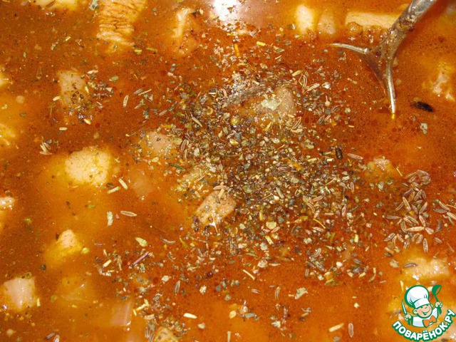 Снять с плиты, немного остудить. Добавить паприку и уксус. Залить все бульоном. Приправить лавровым листом, майораном, тмином, солью и перцем по вкусу.