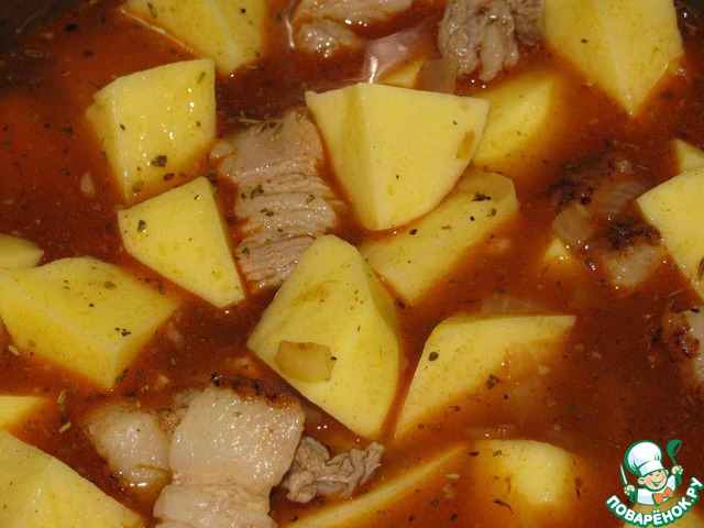 Добавить очищенный и нарезанный кубиком картофель и тушить гуляш около 30 минут. Если в нем будет слишком много жидкости, вынуть несколько картофельных кубиков, сделать из них пюре и вернуть обратно в гуляш.