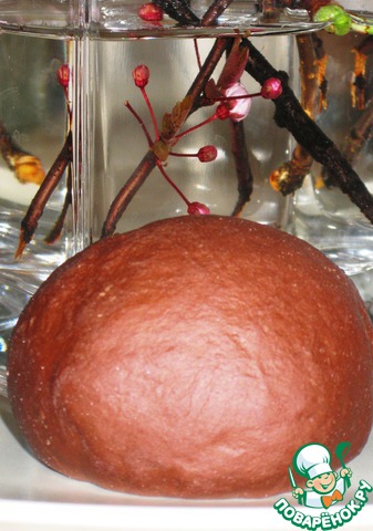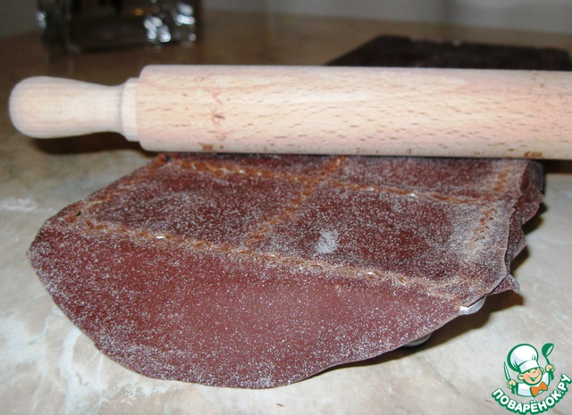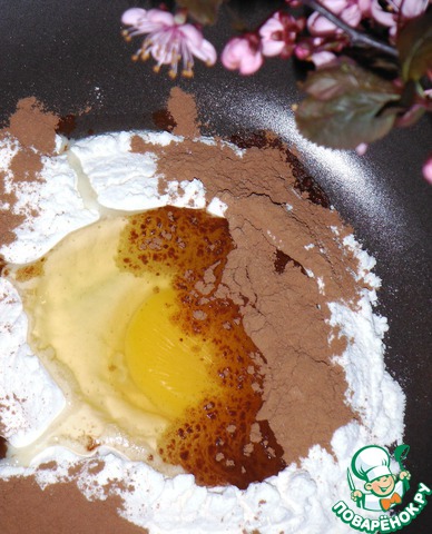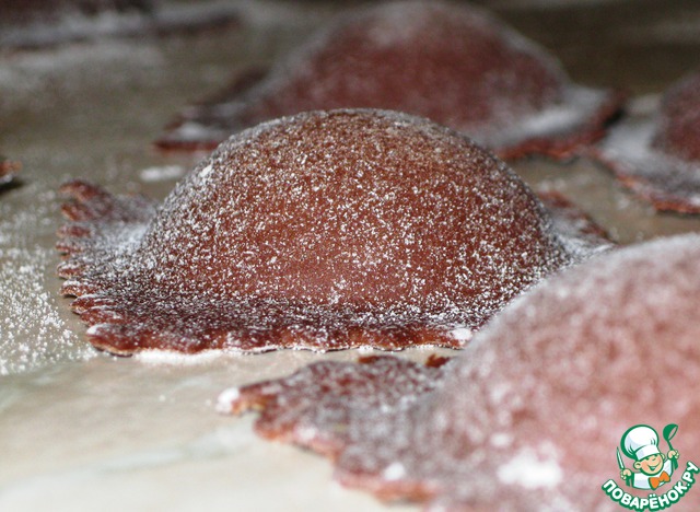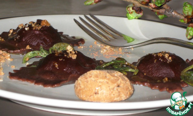 В начале приготовим тесто для равиоли, так как оно должно будет еще и “отдохнуть”. Смешаем муку, какао, яйцо столовую ложку вина и щепотку соли. Вымешать тесто до эластичной и гладкой консистенции, при необходимости постепенно добавляя муку.