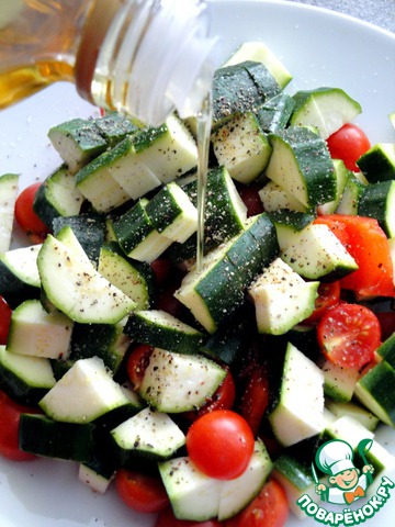 Приготовим овощи. Перец я всегда очищаю, а затем нарезаю. Цуккини и помидоры тоже нарезать. Все полить немного раст. маслом. Присолить, поперчить и, если хотите, добавьте ваши любимые специи, перемешайте.