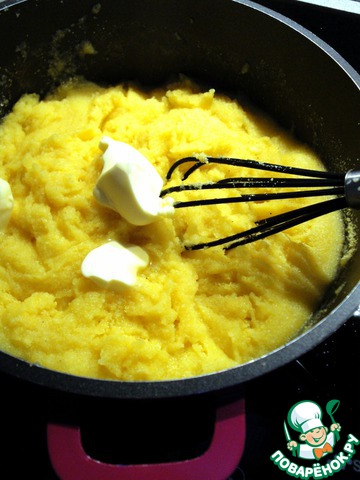 Воду довести до кипения, посолить (2-3ч. л)., добавить мускатный орех. Всыпать постепенно кукурузную муку и, помешивая, варить мин. 2.