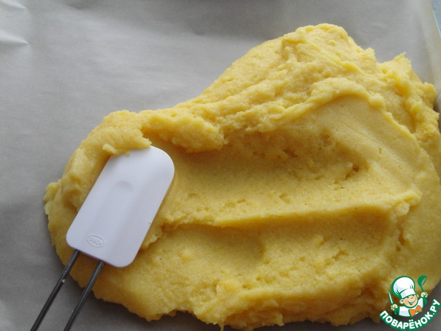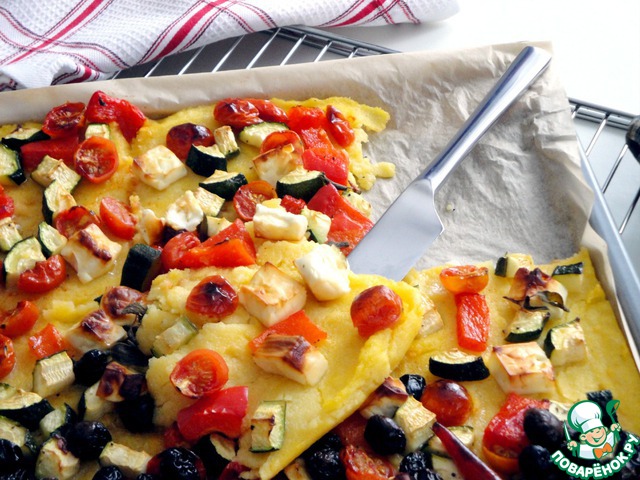 Кукурузную массу выложить на противень. Выложить поверх овощи.