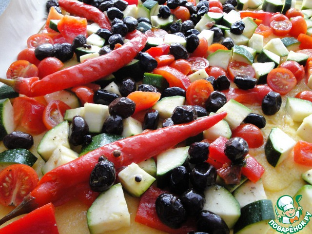 Добавить для любителей оливки и острый перчик. Я для этого случая поделила противень пополам, т. к не ем ни то, ни другое.