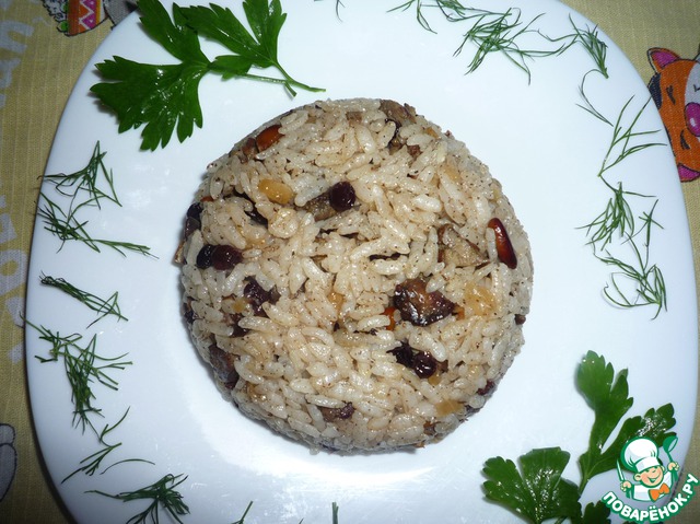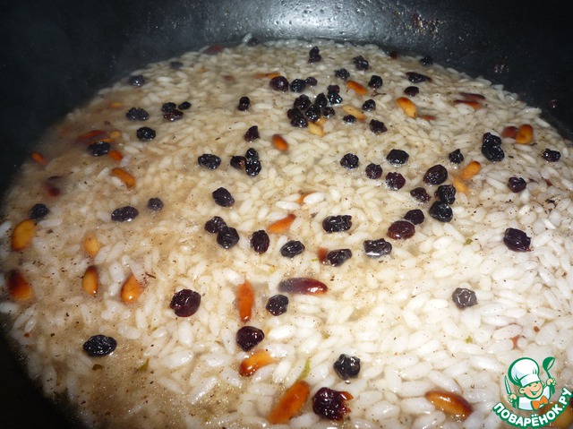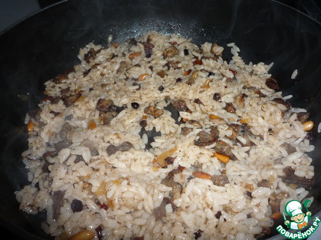 Добавляем мясной бульон. Варим сначала на сильном огне (1-2 мин.), добавляем соль, специи, изюм, затем на слабом огне под закрытой крышкой (10-12 мин.).
