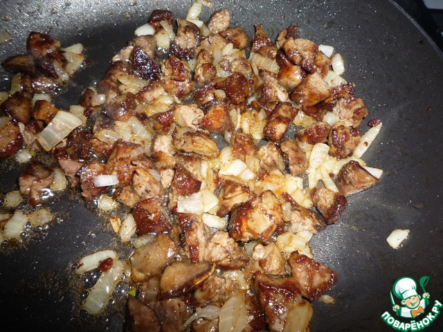 Для начала, хорошенько пожарить мелко нарезанные печень и лук. Посолить.