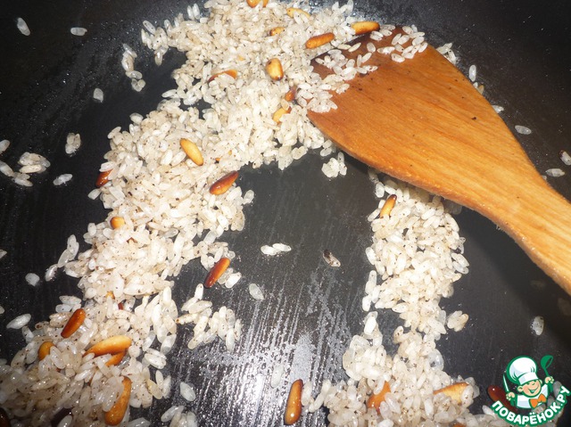 В сковороде разогреть оливковое масло, поджарить орешки. Добавляем промытый рис. Мешаем несколько минут.
