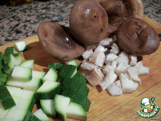 Приготовим шитаке и кабачок. Помоем, высушим и порежим их на кубики.