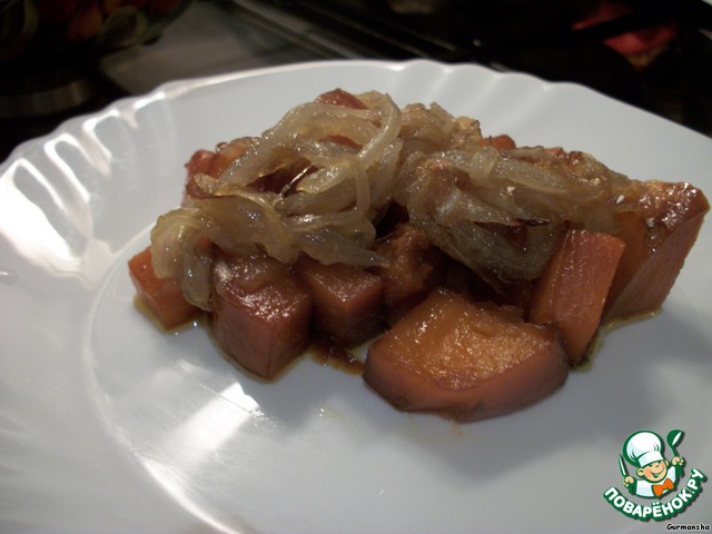 И начинаем собирать блюдо. Выкладываем кусочки тыквы на блюдо, поверх нее раскладываем жареный лук и посыпаем тертым мускатным орехом.