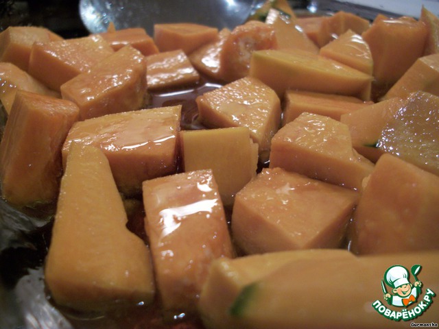 Тыкву нарежем на кубики средней величины и замаринуем в смеси из 1 ст.л. соевого соуса и 2 ст.л. растительного (я брала оливковое) масла. Оставим на 10 минут. Затем поместим в разогретую духовку на 160 градусов минут на 20-30 до готовности.