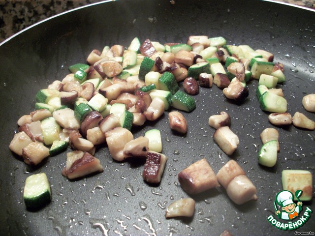 Поверх сыра выкладываем поджаренные грибы с кабачком.