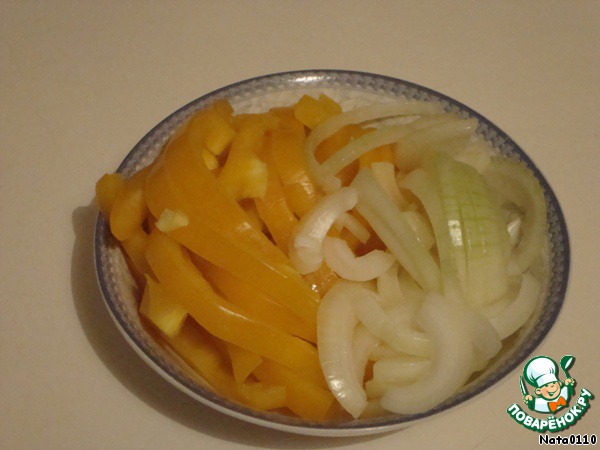 В эту же сковороду положить лук, сладкий и горький перец, обжарить 3 минуты.
