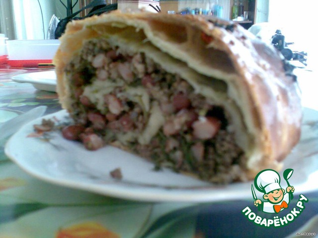 Тесто раскатать в пласт тол. 0. 5 см. На тесто выложить капустные листья на них - ровным слоем фарш. На фарш - фасоль.