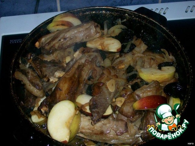 Добавляем к нашим ребрам лук, порезанный толстенькими кольцами или полукольцами, чеснок, порезанный пластиками, сахар, добавляем нагрев и обжариваем минут 5 все вместе. Забрасываем чернослив, порезанный или целый. Я кладу целый, т. к. моя дочь не любит чернослива и ей приходится его выбирать. Предварительно замачивать чернослив не обязательно, он прекрасно успеет распариться в процессе готовки, а если его замочить, он просто развалится в блюде. Кладем яблоки, разрезанные на 8 частей, вливаем уксус и вино. Если жидкости оказалось многовато, выпариваем ее на сильном огне до приемлемого количества, убавляем нагрев, солим, добавляем специи и тушим под плотно закрытой крышкой на слабом огне минут 30 - 40.