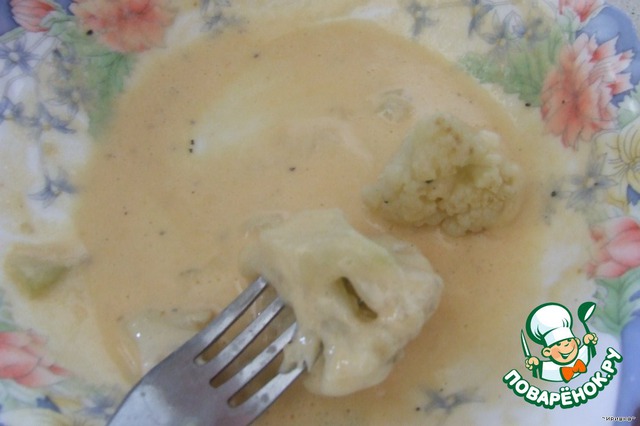 Капусту вымыть, разделить на соцветия, положить в кастрюлю, залить холодной водой и варить до готовности, при этом капуста должна быть мягкой, но слегка похрустывать. Капусту нужно немного посолить. Когда капуста будет готова, слить воду и обсушить на полотенце.