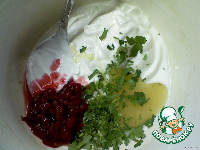 Смешать воду, сметану, мeд, "Вегету", порезанную петрушку.