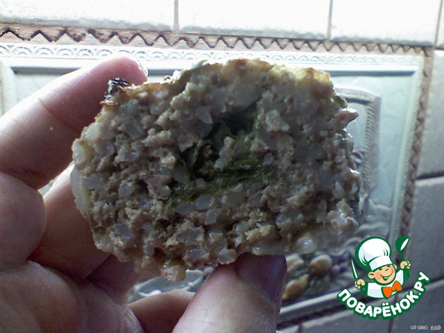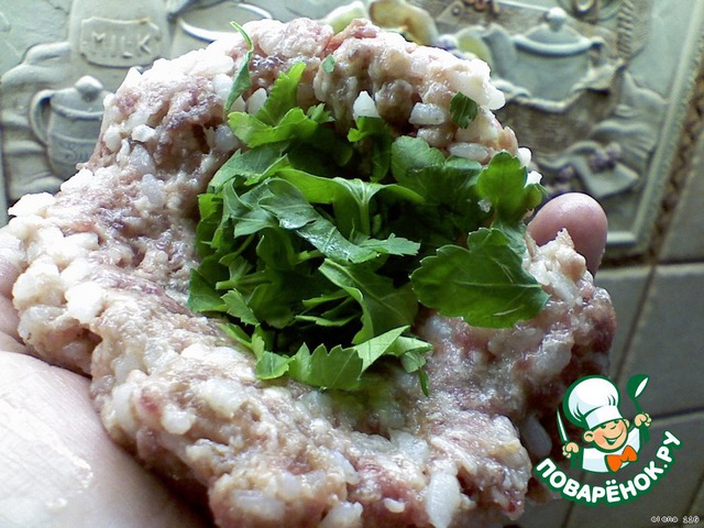 Небольшое количество фарша распределить на ладони в виде круга и положить в середину порцию петрушки.