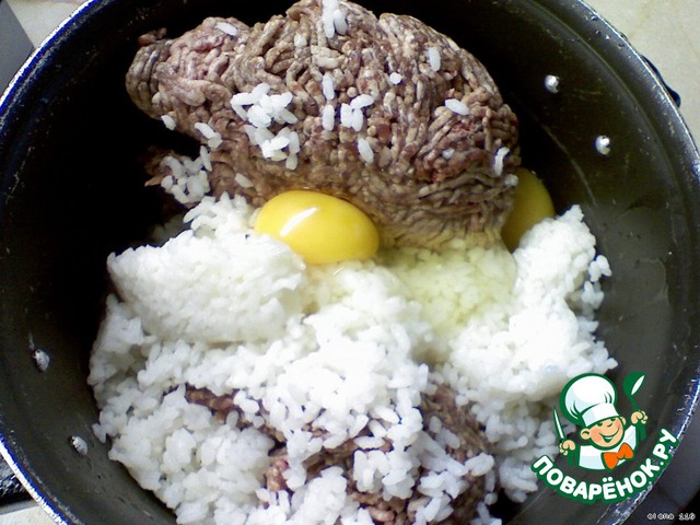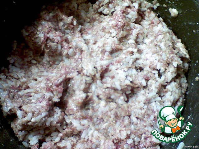 Смешать остывший рис с фаршем, добавить яйца, соль и перец.