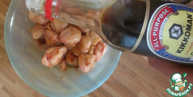 Посолить, поперчить красным жгучим перцем, добавить соевый соус. Оставить на час мариноваться.