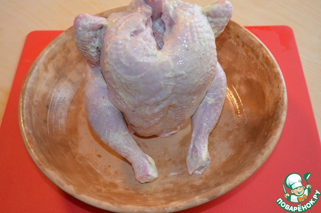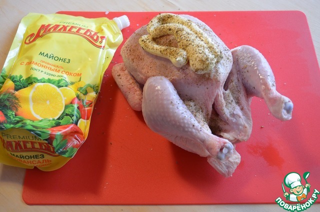 Цыпленка хорошо вымыть, обсушить полотенцем, выложить на него майонез, хмели-сунели, соль, равномерно обмазать со всех сторон и внутри. Оставить цыпленка на 1 час при комнатной температуре.