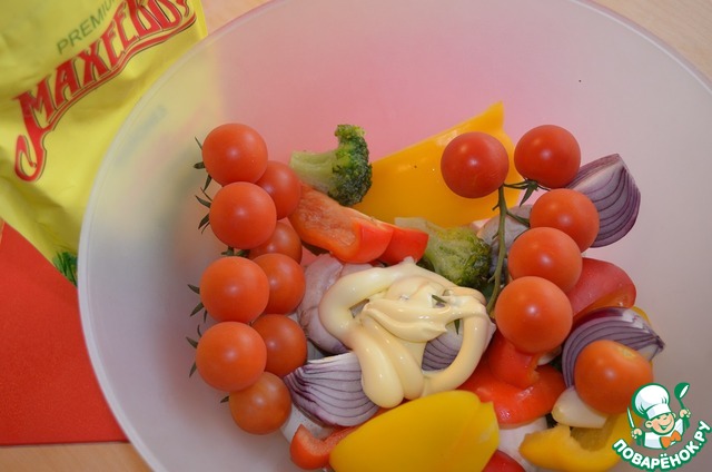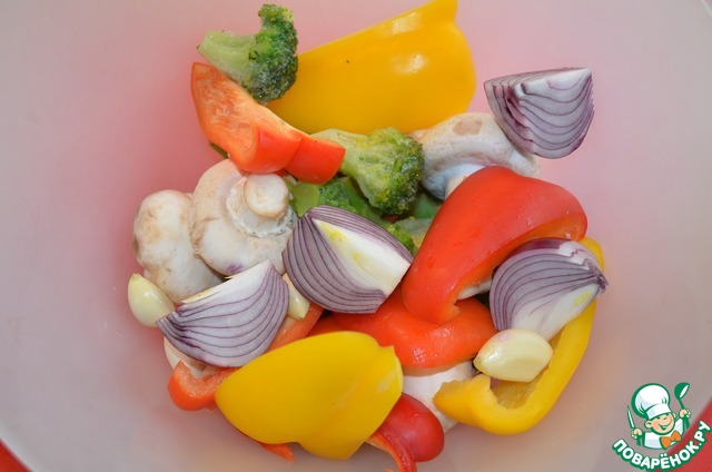 Лук, чеснок почистить. Лук порезать на несколько частей, чеснок оставить целыми зубчиками. Выложить в миску. Хорошо вымыть шампиньоны, их не резать, пусть останутся целыми. Добавить брокколи ( у меня замороженная), помидоры черри. Порезанный сладкий перец.