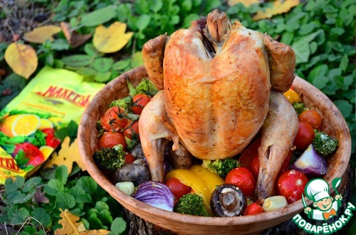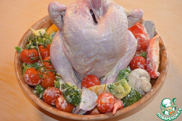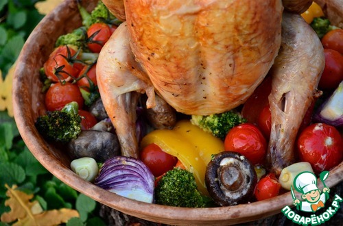 Овощи выкладываем к цыпленку и запекаем в духовом шкафу 45 минут при 190 градусах.
