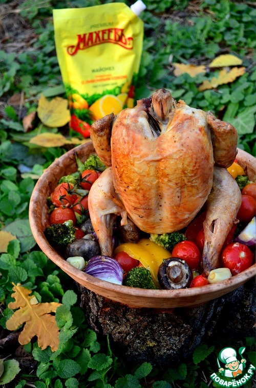 | Этот рецепт для любителей курочки запеченной вместе с овощами под майонезной корочкой. Получается очень вкусно и сочно. От овощей образуется немного бульона, в который можно макать хлебушек. Курочка получается запечено-пареная и пропитанная изнутри тонким ароматом вина. Пожалуйста, не относитесь критично к этому блюду, ведь пропорции майонеза в нем в разумных пределах. |