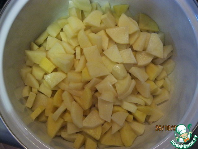 Приготовить большую кастрюлю, в нее мы будем складывать все ингредиенты. Картофель очистить, нарезать крупными ломтиками.