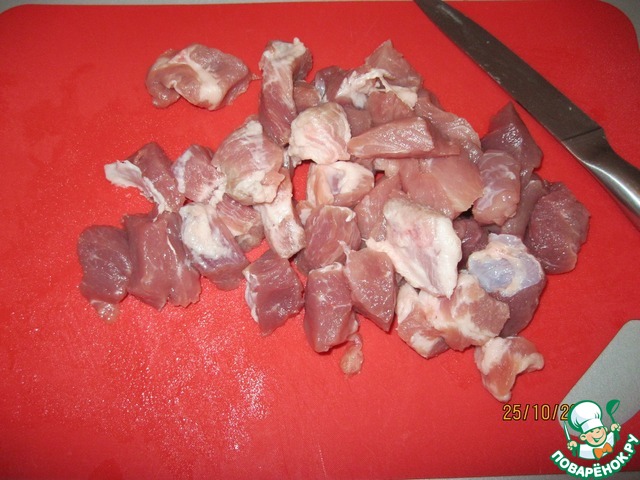 Также, ломтиками, нарезаем свинину. И кладем в кастрюлю вместе с картошкой.