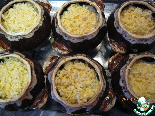 Разложить по горшочкам. Полить сметаной и посыпать натертым на крупной терке сыром. В каждый горшочек добавить немного водички. Закрыть крышкой. Духовку нагреть до 200 градусов, запекать 40 минут.
