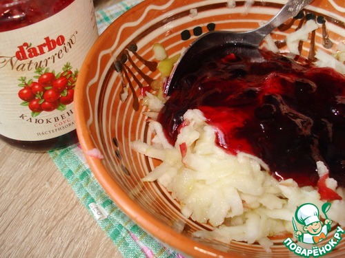 Готовим начинку. Яблоко очищаем и трем на крупной терке, добавляем 3 столовые ложки клюквенного соуса от D'arbo.
