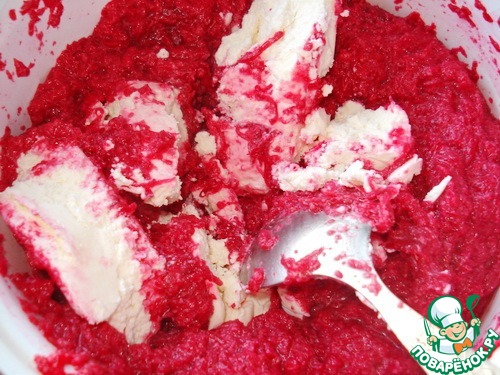 В форму смазанную маслом и посыпанную сухарями выкладываем половину творожно-свекольной массы, потом начинку и опять свекольно творожную массу.