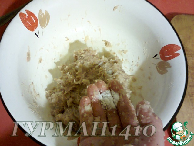 Чтобы фарш не приставал к рукам, ставим рядом мисочку с холодной водой и периодически опускаем пальцы в воду.