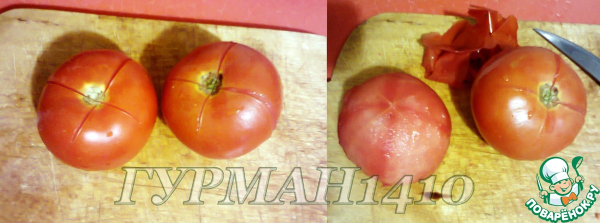 12. Подготовить помидоры. Делаем крестообразные надрезы, обдаем кипятком, снимаем кожуру.