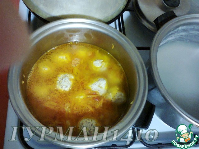 На дно кастрюли выкладываем заправку, на нее тефтели. И так слоями. Заправка –тефтели - заправка и т. д...