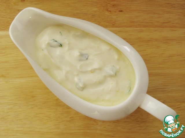 8. Приготовим соус. Йогурт (или сметану) смешать с 1 ст. л. измельченного базилика, 0,5 ст. л. лимонной цедры и 1 ст. л. оливкового масла, добавить соль и перец по вкусу.