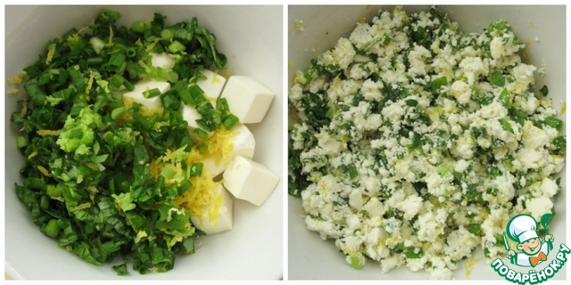 5. Сложить в миску лук, базилик, лимонную цедру и фету. С помощью вилки все хорошо размять и перемешать.