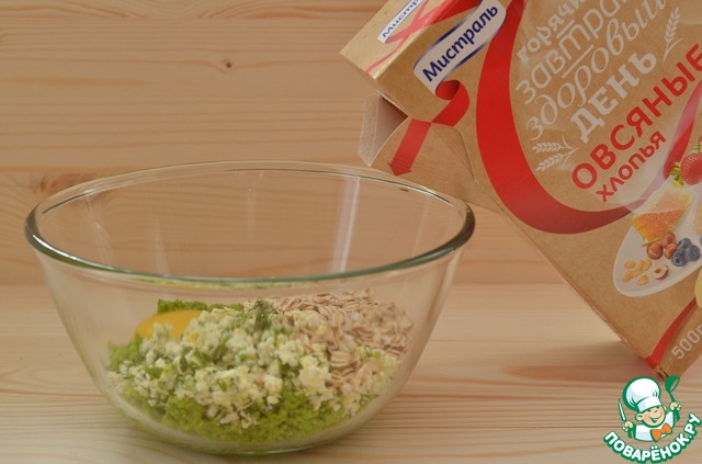 6. К гороховому пюре добавить сырную массу, яйца, овсяные хлопья, посолить, поперчить, хорошо перемешать и оставить на несколько минут.
